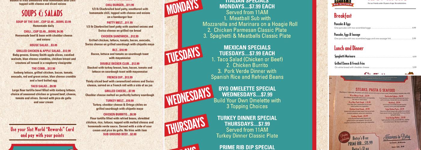 Betsy's Big Kitchen, located inside Slot World casino in Carson City, offers great food at affordable prices with generous portions. The restaurant provides friendly and attentive customer service, ensuring that customers feel welcomed. This hidden gem is found at the corner of Highway 50 and College Parkway, known for its consistent quality. Must-try dishes include French toast, fish and chips, and scrambled eggs. Customers often praise their chili cheese fries, unique to the casino and highly recommended. The fish & chips and sandwiches, like the Philly cheese steak and chicken sandwiches, are also popular choices. The dining room has a nice atmosphere, and the staff is friendly and helpful, contributing to a pleasant dining experience. While some visitors have noted occasional service delays, many enjoy the wonderful food, great service, and friendly employees, making Betsy's Big Kitchen a favorite spot for a satisfying meal at unbeatable prices.