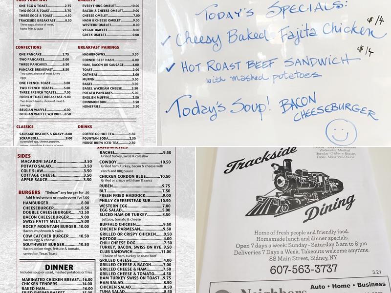 Trackside Dining offers delicious food served hot with amazing krinckle cut fries. The environment has a down-home feel, reminiscent of an old-style diner. They provide excellent service, good food, and reasonable prices, accommodating dietary restrictions with a willingness to help. Guests appreciate the friendly servers and the restaurant’s effort to ensure customers are not left waiting, even when short-staffed. While some reviews mention issues with food temperature and presentation, many diners find the taste to be amazing, often better than homemade. The restaurant has off-street parking and a municipal lot nearby. Guests especially enjoy the Rachel sandwich, turkey club, and the tasty Manhattan clam chowder, promising to return for more enjoyable meals.
