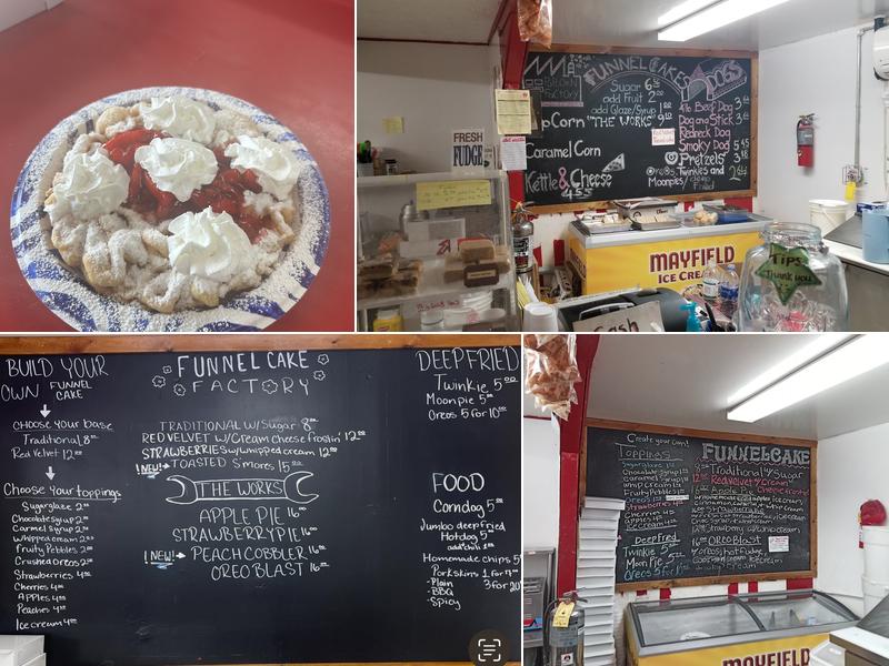 Funnel Cake Factory is a popular spot known for its delicious funnel cakes, ice cream, and sweet treats. In addition to ice cream, they offer popcorn, fudge, pork rinds, hot fudge sundaes, milkshakes, and a variety of funnel cakes. The atmosphere is friendly and welcoming, making visitors feel like they are in a classic sweet shop. Customers especially enjoy the Mayfield ice cream, with many praising the strawberry cheesecake flavor served in a waffle cone. The staff are kind and eager to make sure everyone has a good experience, working hard to please guests. Many recommend trying the s'mores funnel cake and the red velvet funnel cake, while some say the apple pie funnel cake is the best they've ever had. The sturdy to-go boxes make it easy to enjoy these treats later. Overall, with excellent service and a charming vibe, Funnel Cake Factory is a must-visit for funnel cake lovers. The owner and workers are very friendly, and visitors often find the treats fresh and tasty, especially when enjoying a funnel cake made to order.