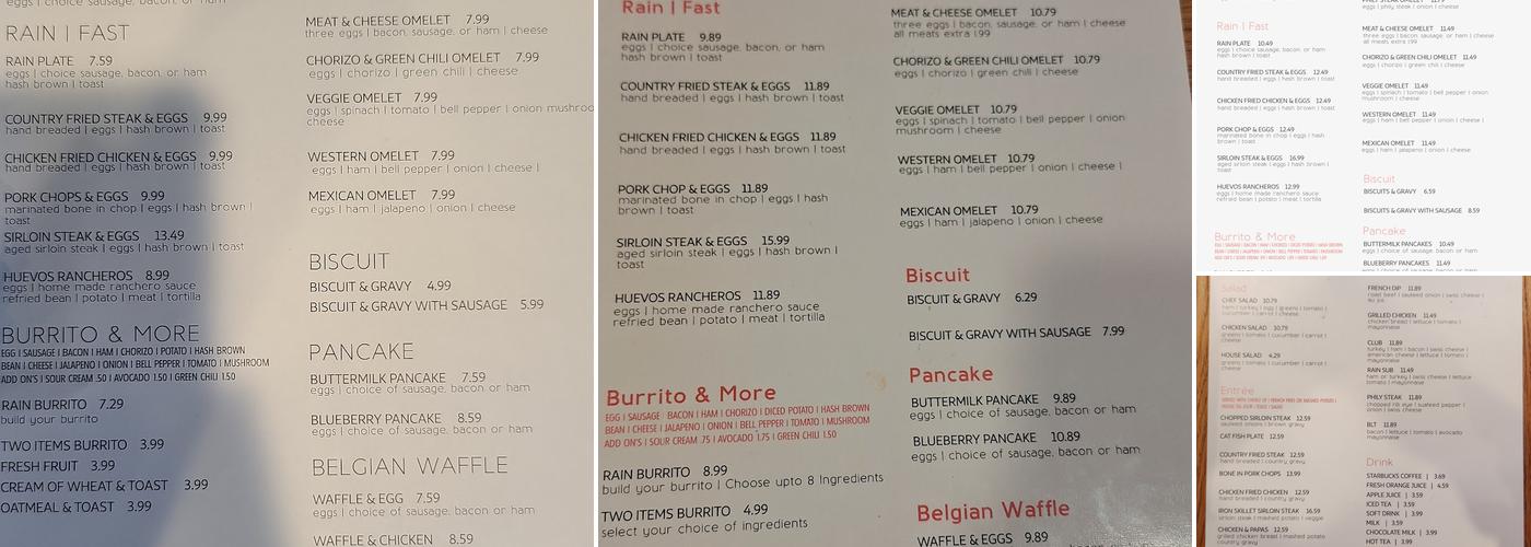 Rain Cafe is a popular restaurant known for its excellent food and friendly service. Customers enjoy dishes like the crusted french toast and chicken fried steak. The wait staff is attentive, and the bathrooms are clean. Many visitors praise the Saturday breakfast with a pork chop, eggs, hashbrowns, and pancake, noting the pork chop is thick and juicy. The Sunday lunch featuring chopped steak with brown gravy, mashed potatoes, corn, and salad is described as the best homemade food in a long time, with great prices and a simple but varied menu. Some diners feel portions could be bigger for the price, and parking can be limited due to the restaurant's popularity. Overall, Rain Cafe offers a cozy experience with good food and top-notch service.