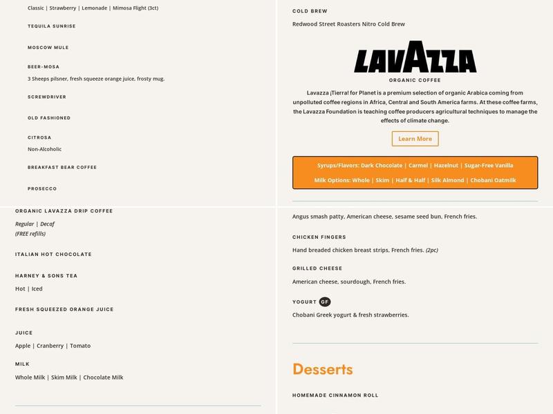 The food is exquisite and beautifully served, the coffee bar is awesome also. Our server brought us a sample of the soup "Mushroom Beef" and it was so delicious. From what we saw of plates being delivered to guests we can't wait to try every breakfast, lunch, salad and soups on the menu. You definitely won't leave hungry at the Breakfast Bear ever and we unfortunately didn't have room for dessert! This is going to be our go to place from now on!! Thank you so much.