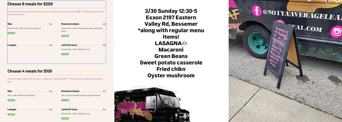 Great customer service. Food was fresh. I received my food within five minutes of ordering it from the food truck. Worth every penny and I have enough leftovers for dinner. Highly recommend you give Not Ya Average Leaf a try. You will not be disappointed.