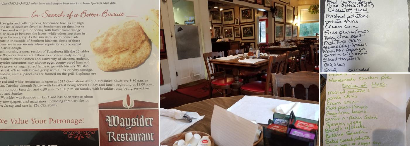 Waysider is a restaurant in Tuscaloosa known for its breakfast offerings. The country ham, red eye gravy, scrambled eggs, and homemade biscuits are particularly praised. The biscuits are described as "elite" and "the biscuit that your grandmother intended for you to have at every breakfast." The pancakes and sausage also receive positive mentions. The restaurant has a great college diner atmosphere, with tight seating inside, and the service is friendly and attentive. The staff makes guests feel very welcome, and the service is often described as fantastic with good recommendations. The food is on point, with perfect coffee, biscuits, and eggs, and the plates are filling and reasonably priced. The restaurant is also known for its Alabama football theme, and staff often talk football with guests, showing warm southern hospitality. It is a traditional meeting place for a group of older gentlemen each year and is appreciated as a hidden gem by visitors who return for the excellent and filling food. Visitors mention the authentic country cooking, including delicious fried taters, and the small charming house setting adds to its character. Some reviews note minor issues like a faint smell of mildew and the skin on the plantation sausage being hard, but overall, the atmosphere, friendly staff, and quality food make it a favorite spot for breakfast in Tuscaloosa.
