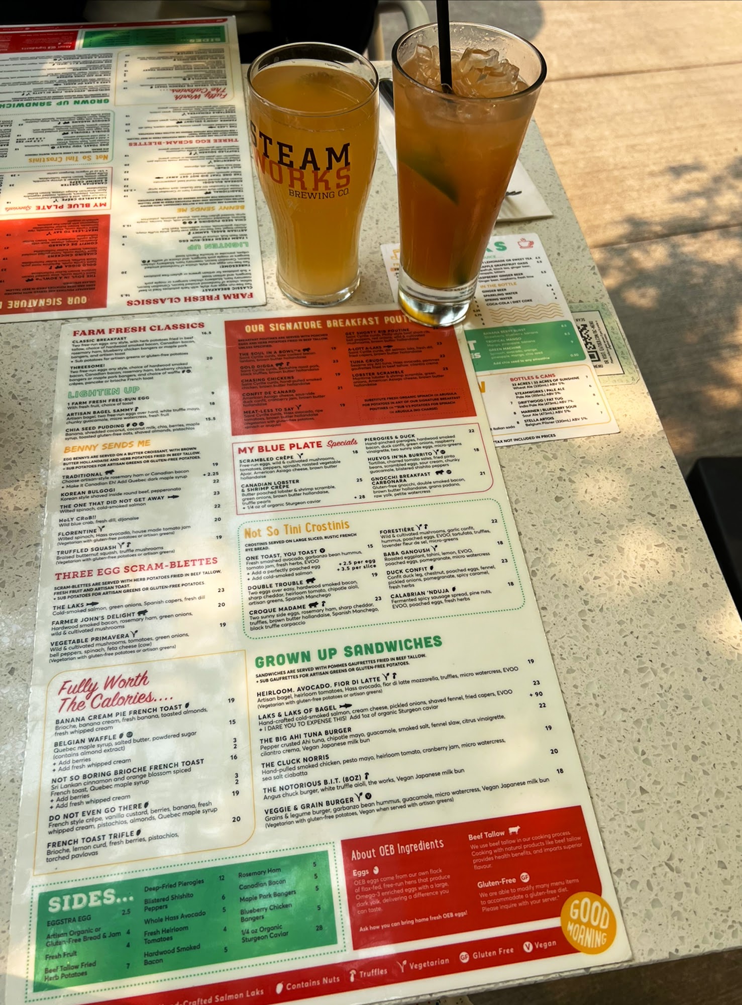 It's nice to wake up, go out, and actually be able to walk to a place that serves breakfast. OEB is located at the Amazing Brentwood. It's not a big restaurant, so it gets packed in here. Why? Because of the great service and good food. The staff is very courteous and on the ball. The food is very tasty. I've had the Spinach Benny before, so I decided to have the basic Benny with Canadian ham. My wife ordered the classic breakfast. There's an outdoor patio...