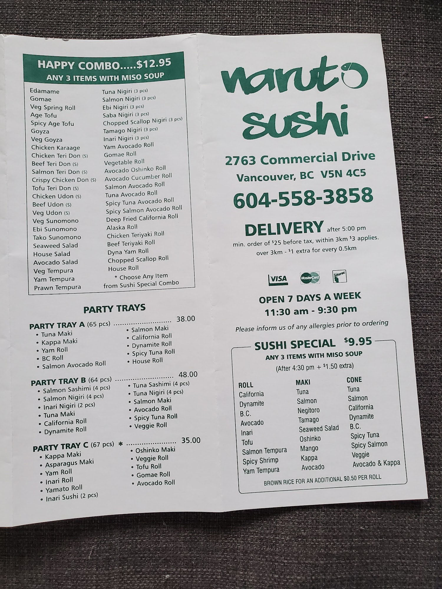 65 pcs. Tuna maki, salmon maki, kappa maki, California roll, yam roll, dynamite roll, BC roll, spicy tuna roll, salmon avocado roll, and House roll.