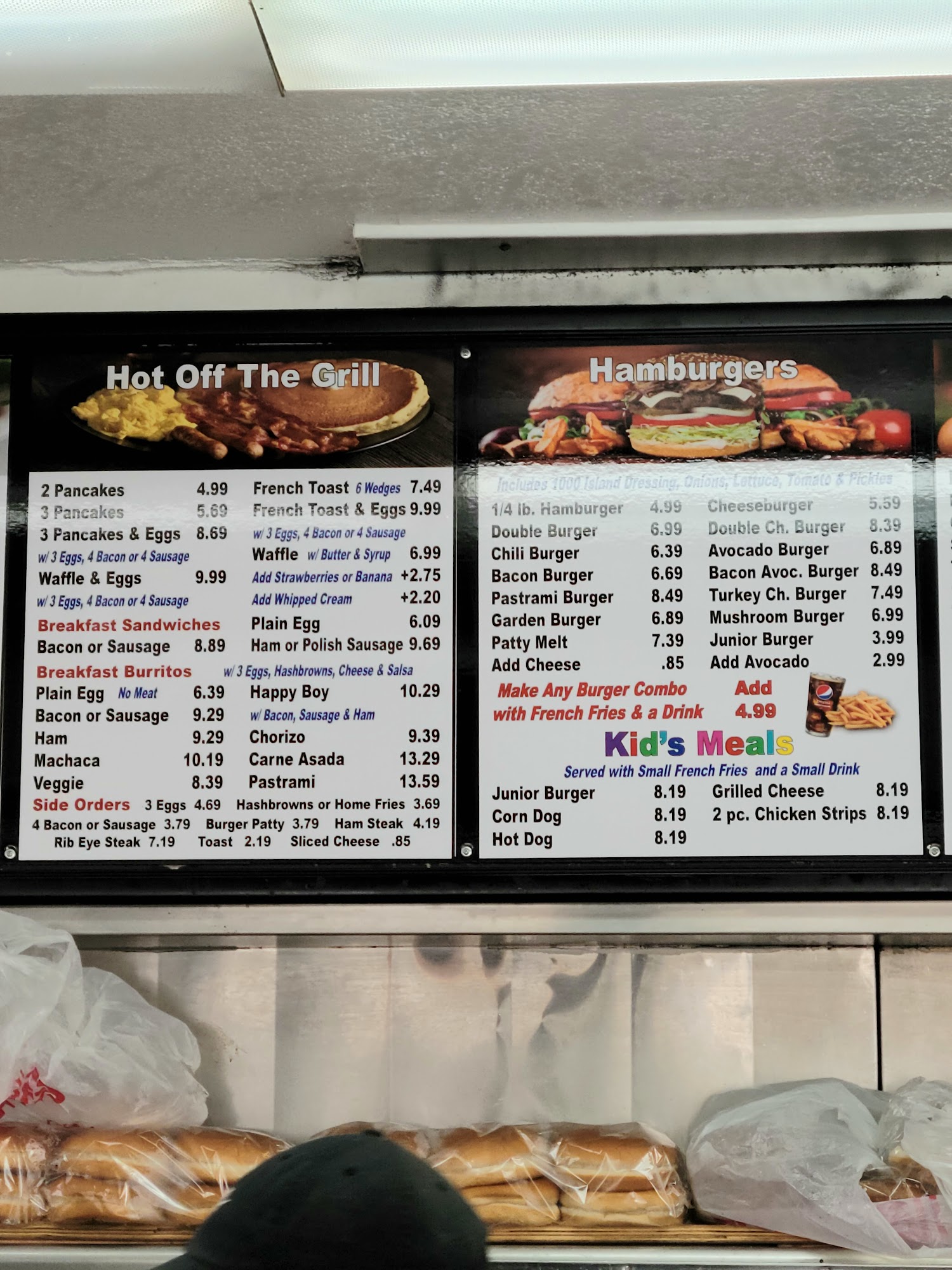 1 burger patty, 3 eggs, choice of a breakfast side, and a bread side.