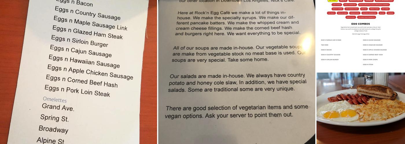 Rock'n Egg Cafe is a cozy spot with a mom-and-pop charm, now recognized as a sister restaurant to Nick's Cafe in downtown LA. Known for its "early bird specials," the cafe offers delicious options like the California scramble and hot cakes, which have received positive feedback for their taste and flavor. The food is satisfying for breakfast and includes large portions that are well priced. The cafe is kid-friendly, providing high chairs and special menus along with fun activities for children. The service is exceptional, highlighted by friendly and attentive staff, including the helpful server Hanna. The Roast Brisket and Eggs remains a standout dish, with brisket that melts in your mouth and hash browns served with homemade salsa. Customers have also raved about the Huevos Rancheros and the French toast, along with the Mexicali (chilaquiles with eggs, cheese, and avocado). Although there have been mentions of limited parking, the warm atmosphere and great food make Rock'n Egg Cafe a hidden gem worth visiting when in LA.