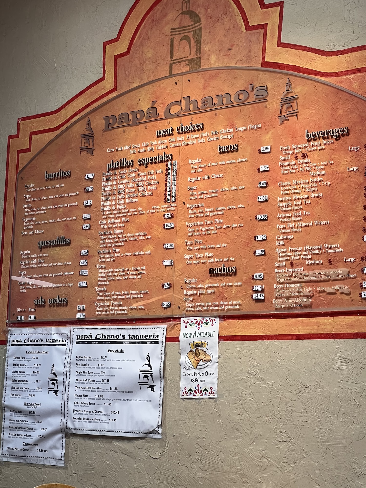 Well on are road trip was feelin like some Mexican food spotted this place papa chano's in Monterey Bay ordered a asada burrito bean only homemade tortillas homemade bean also ordered 1 taco de alpastor delicious they have different heat ranges on there homemade salsa 😋 my wife order a flauta plate with rice beans she enjoyed it .nice place to try if you're ever out in Monterey Bay owners are so friendly helpful