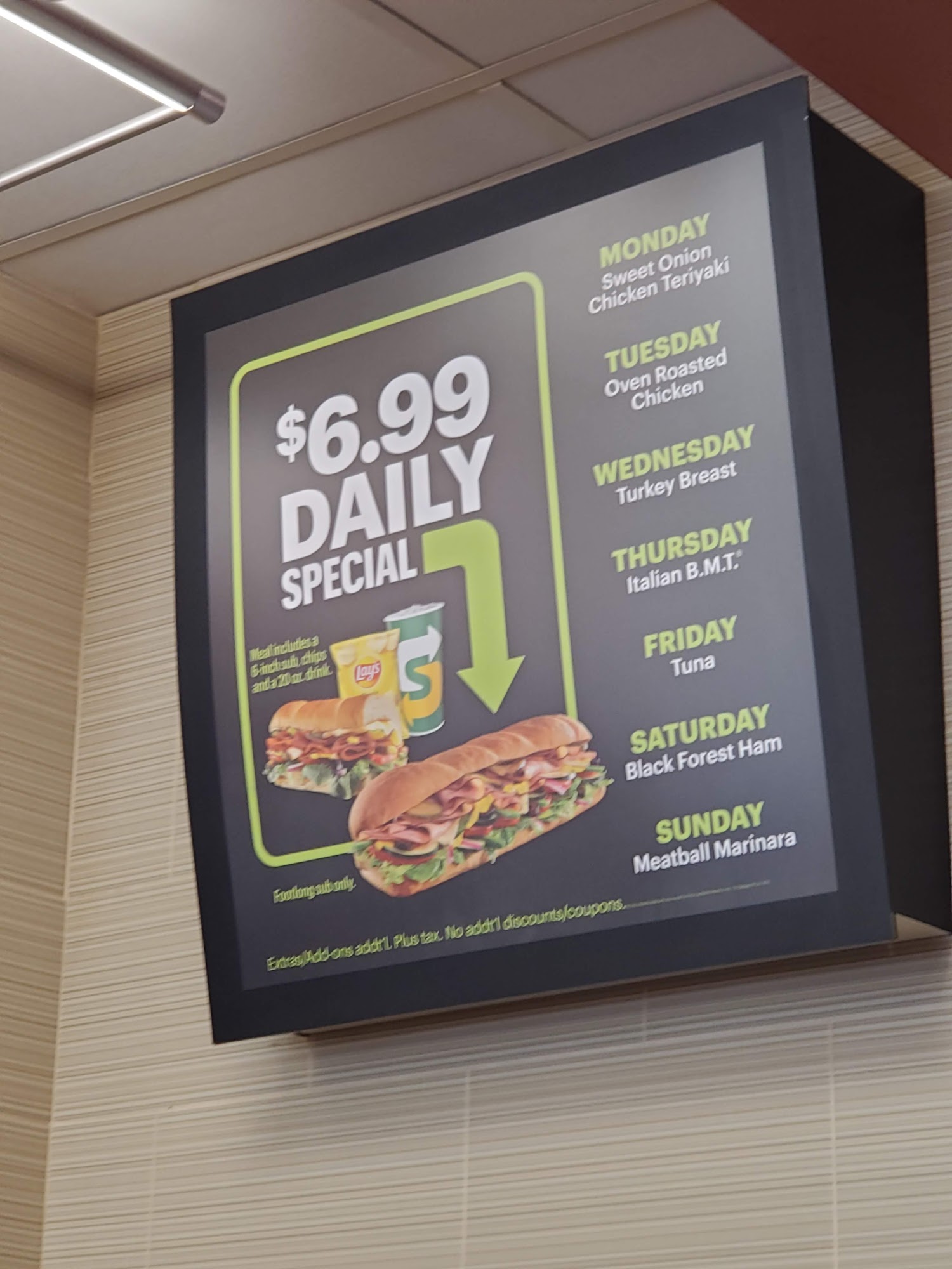 At 530pm on Thursday they were already out of meatballs. I got 8 scrawny meatballs from the bottom of the barrel, on a footlong pro. The server argued that that was what they always put on. The sandwich looks pathetic.Revised review...The manager came in and finished making my sandwich. He made more meatballs and when I unwrapped it I found a sufficient amount of meatballs. So I'm revising my review. The sandwich is acceptable but the server could have been more proficient....