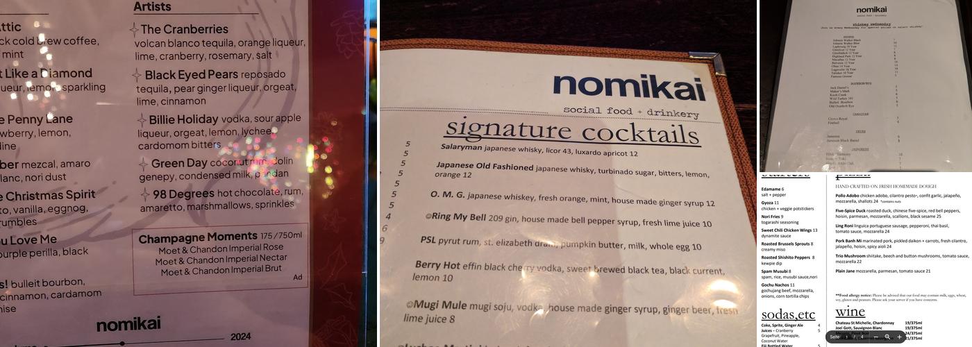Nomikai is a lively spot in downtown San Jose, known for its Asian-inspired cocktails, festive atmosphere, and diverse crowd. The bar offers a range of unique drinks, including the lychee martini, punch bowl specials like the Fountain of Youth, and the seasonal Green Day cocktail, which has received high praise. The music often features R&B and hip-hop artists such as Frank, Anderson Paak, and Sza, creating a relaxed and fun vibe where guests can dance a bit and enjoy good service. The food menu includes dishes like Miso Mac N Cheese, Five Spiced Duck Pizza, and Trio Mushroom Pizza, which are popular among visitors. Many find the pizzas especially creative and flavorful, showcasing excellent fusion flavors. The venue tends to get crowded, especially on weekends, attracting young Asian Americans and a trendy crowd. During holidays, Nomikai adds festive touches with lights and decorations, making it a great spot for a quick dinner and drinks. Overall, it’s a chill place to hang out, enjoy good drinks, and have a good time with friends and strangers alike.