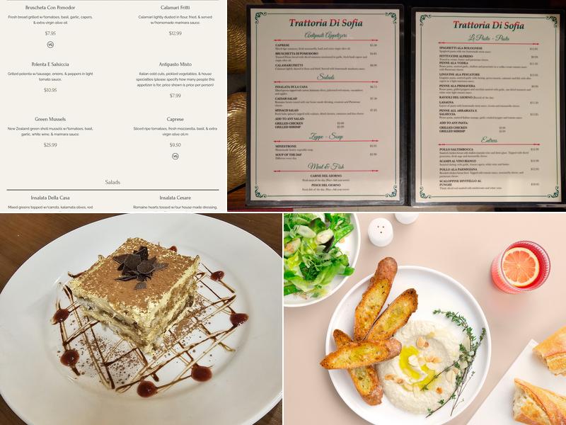 Trattoria Di Sofia offers a great atmosphere and food, with a varied menu featuring Italian-inspired pasta, appetizers, salads, and soups. The food is fantastic, and the drinks are generous and reasonably priced. While the service can be a bit disorganized and slow, it is generally good. The restaurant's cheesecake is phenomenal, and the house salad with Italian dressing and Lasagna are favorites among customers. Some dishes, like the marinara sauce, may not meet expectations, as it tastes like store-bought. The atmosphere is decent, with a well-lit and busy setting, although new tables and chairs could enhance the experience. Trattoria Di Sofia is a clean option with a superb wine list, making it a hidden gem for date nights or special occasions. Overall, it is a consistent choice with many wonderful dishes at reasonable prices.
