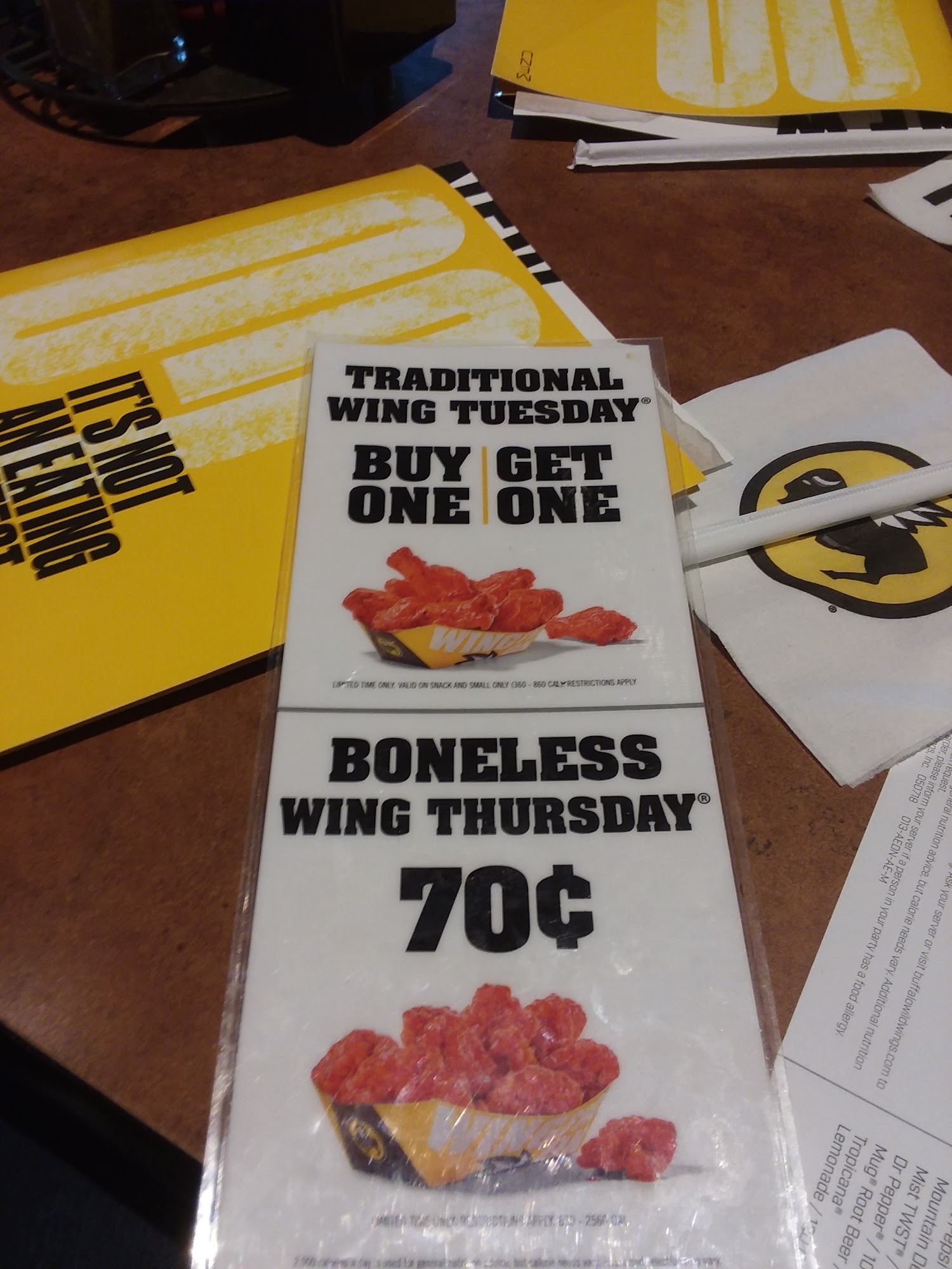 Food was decent, but nothing very hot. Service was good, but with only two servers, one bartender, and a host that definitely didn't want the be there the place was messy. The attention that detail was not there. Never saw a manager at all during the three hours there watching football. The four team members were doing their best. Buffalo Wild Wings definitely has slipped when it comes to standards.