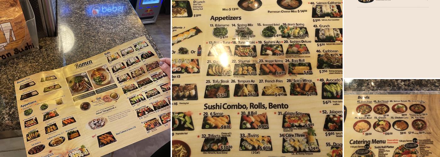 Iron Sushi is a small restaurant with a convenient location and unique menu options. The online presentation is well-done, but some dishes may not meet expectations. The cooked rice is placed outside the restroom, uncovered.
