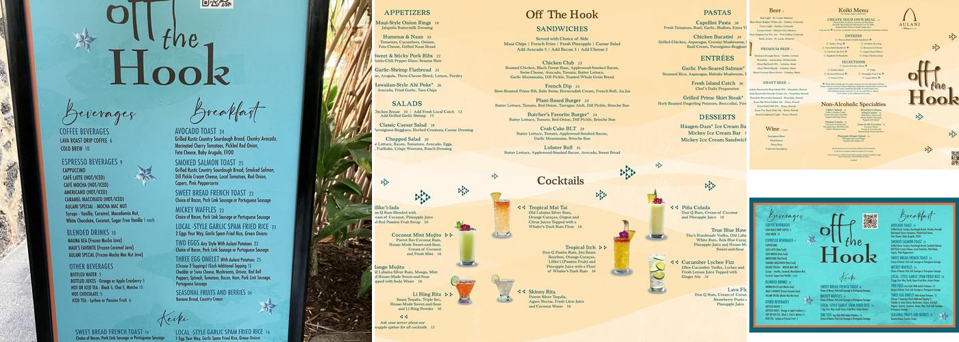 Off the Hook is a poolside restaurant at a Disney-owned resort that offers quick service for breakfast and table service for lunch and dinner. The restaurant features an unforgettable atmosphere with a phenomenal view and open-air seating, allowing guests to relax and enjoy the beautiful setting. The bartenders are recognized for their accommodating service, and the poke is described as fresh and tasty. The menu includes a good selection of pupus, meals, and adult beverages. Popular choices include the prime rib dip, French Dip, Crab BLT, and chicken pasta dish. Guests have noted that the overall prices are fair considering the resort location, with dinner for two and mocktails often coming in under $100. Off the Hook is a fantastic dining option with great food, drinks, and service in a stunning environment, enhanced by a nice breeze and beautiful sunset colors.
