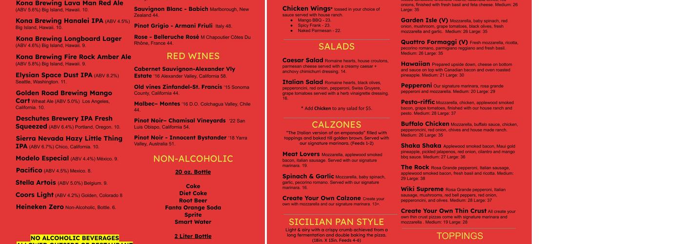 Wiki Pizza offers a satisfying dining experience with a focus on fresh and flavorful toppings. The crust is crispy, thin, and light, and the portions are generous. The restaurant is located within a resort in Princeville, providing a breathtaking view of Hanalei Bay from its super large open-air patio. The service is attentive, fast, and friendly, with kind and helpful staff. Customers appreciate the laid-back vibe and stunning sunsets. The menu features a variety of options, including the Pesto-riffic, The Rock, and Spicy Pepe pizzas, all cooked to perfection with a perfect sauce-to-cheese ratio. Free valet parking is available, as the restaurant is inside a hotel, and there is a koi pond to entertain young kids. Despite some mixed reviews regarding specific dishes, such as the garlic knots and the garden island veggie pizza, Wiki Pizza remains a great choice for a delicious dinner in a casual and relaxed atmosphere.