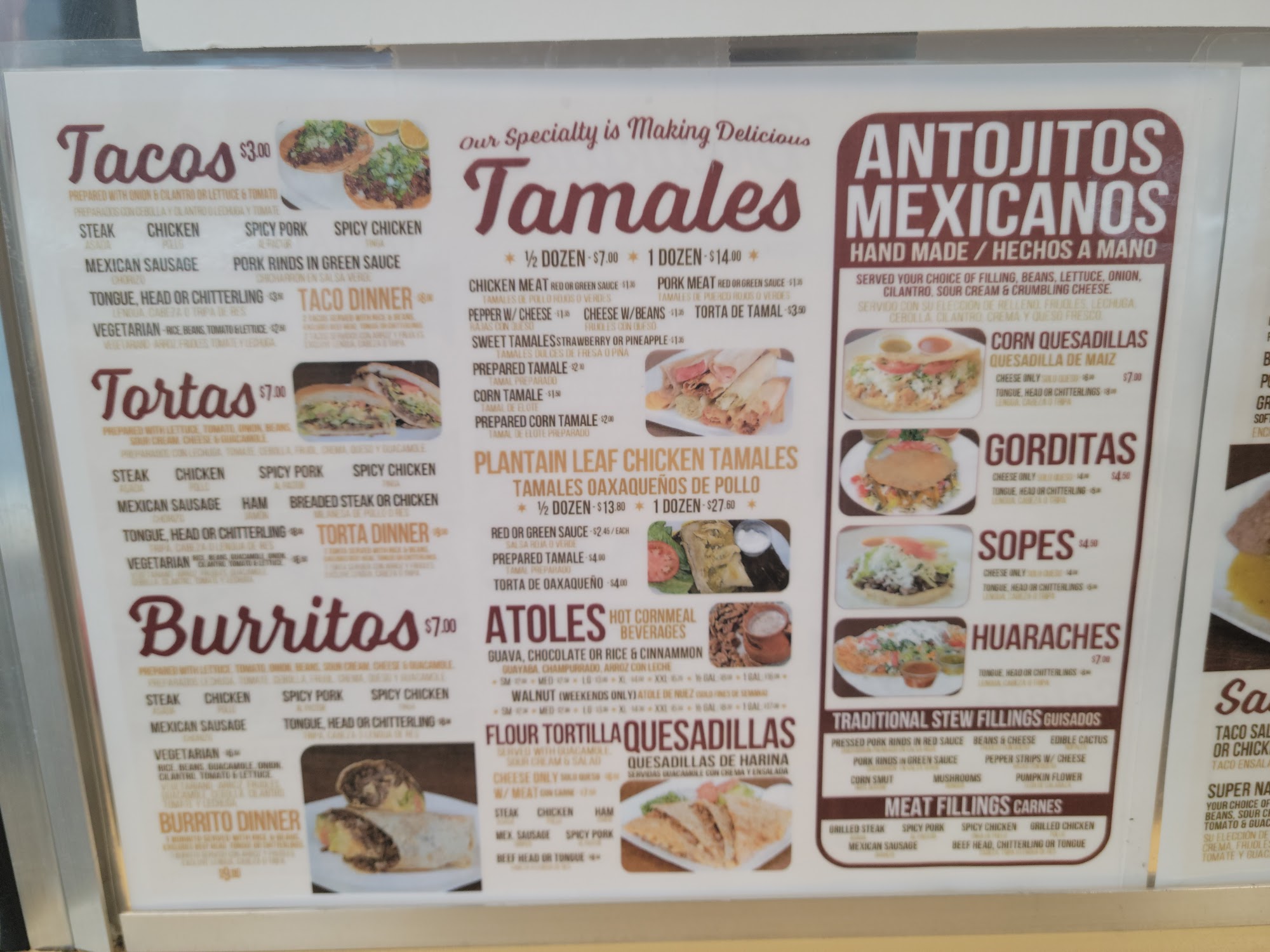 Tamales are good place needs to be cleaner also did you know that this place charges it's customer a fee of 3.99% of your purchase As far as I can remember that is illegal... Service charge shouldn't be charged to customers