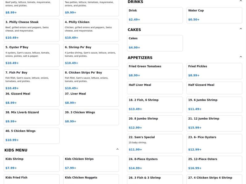 Sams Southern Eatery offers fresh, Southern-style cuisine in a casual and accessible atmosphere. The restaurant features a wheelchair ramp and wide aisles, making it comfortable for all guests. Parking is available around the building. The food is consistently delicious, with generous portions and high-quality ingredients. Customers praise the friendly service, noting that the staff is accommodating and ensures a pleasant dining experience. Whether you're craving a hearty lunch or a satisfying dinner, Sams Southern Eatery is a fantastic choice for authentic Southern fare. The menu features a variety of options, including delicious cheeseburgers, chicken nuggets, shrimp, fish, and even chicken gizzards. Desserts like chocolate cake and cookies and cream cake are also a hit with the kiddos. Overall, Sams Southern Eatery is an affordable and enjoyable dining experience, with a team that is dedicated to providing excellent service and mouthwatering Southern cuisine.