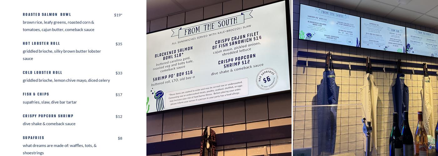 Dive Bar offers a slightly limited menu but manages to satisfy even picky eaters. The shrimp bowl was enjoyable, although some flavors may not mix perfectly. The rice with butter is indeed rich. The fish and chips come with a mix of crispy, well-salted fries. The clam chowder and salad are delicious, with a variety of fries to enjoy. The oysters are perfectly shucked and briney, served with tasty sauces. The fish and chips feature a mix of crispy fries, including shoestring, curly, tots, and onion rings. Quick and friendly service adds to the positive experience at Dive Bar.