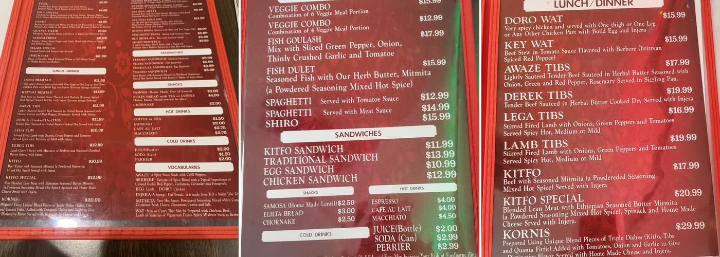 Had the Awaze Tibes. Very succulent and tasty. Came with a side of corn meal I think it was and lots of Injera bread. Everything cooked to perfection. The owner and cook was very pleasant and accomodating. Hope to be back soon.