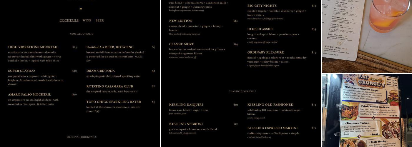 Kiesling is an intimate cocktail bar located in a quiet street corner, housed in a building dating back to the 1890s that exudes old-world character with exposed brick and warm wood. The bar offers a cozy atmosphere with a mix of vintage charm and a modern vibe, featuring dim lighting that creates a perfect mood for relaxing or enjoying a night out. The interior blends vintage decor with a fun retro style, and customers can choose from multiple seating options, including a small, fenced patio with a fire, adding to the inviting environment. Known for its impressive mixology, the bar crafts outstanding cocktails like Windsor Energy and Margarita Coded, which are described as insanely smooth, refreshing, and well-balanced in flavor. The seasonal menu combines innovative cocktails with classics, making it a favorite among locals and visitors alike. The friendly and attentive staff ensures a welcoming experience, making it an ideal spot to unwind, take in the atmosphere, and enjoy quality drinks. Occasionally, Kiesling hosts pop-ups with a local taco truck, adding extra fun to the visit. Overall, it’s a cozy Detroit gem that combines history, great cocktails, and a relaxed vibe.