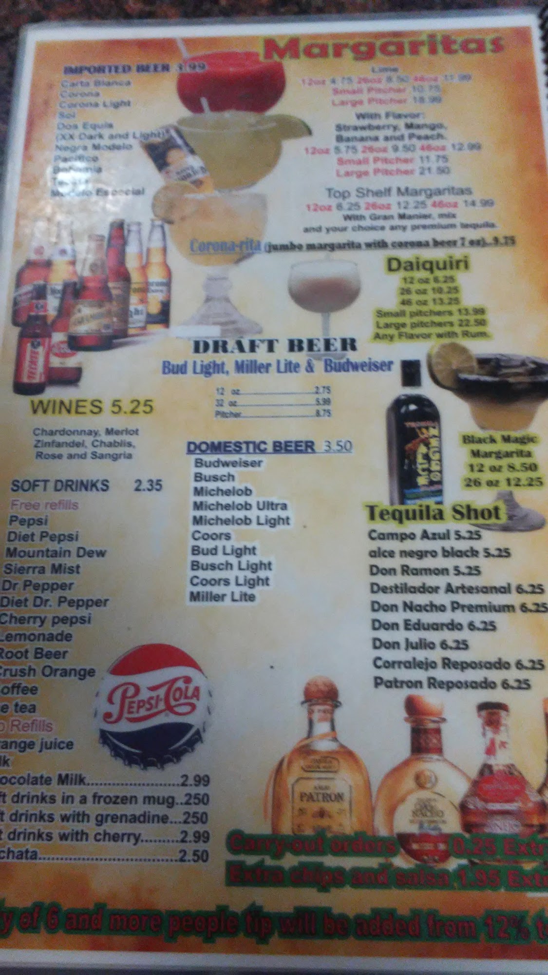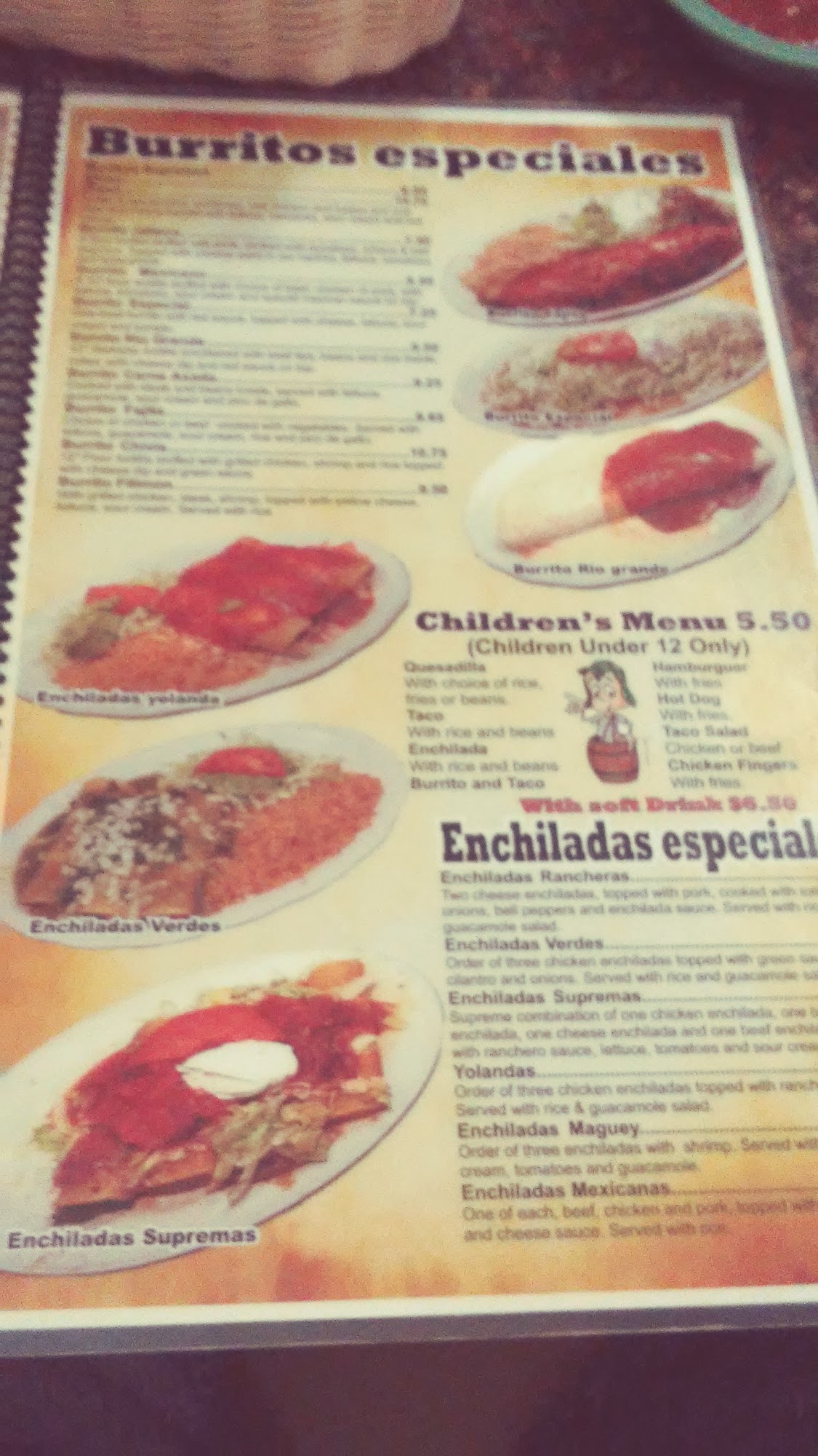 Steak or chicken, cooked with onions, bell peppers, & tomatoes, filled with fried beans, served with rice, lettuce, tomatoes, sour cream, guacamole, & pico de gallo
