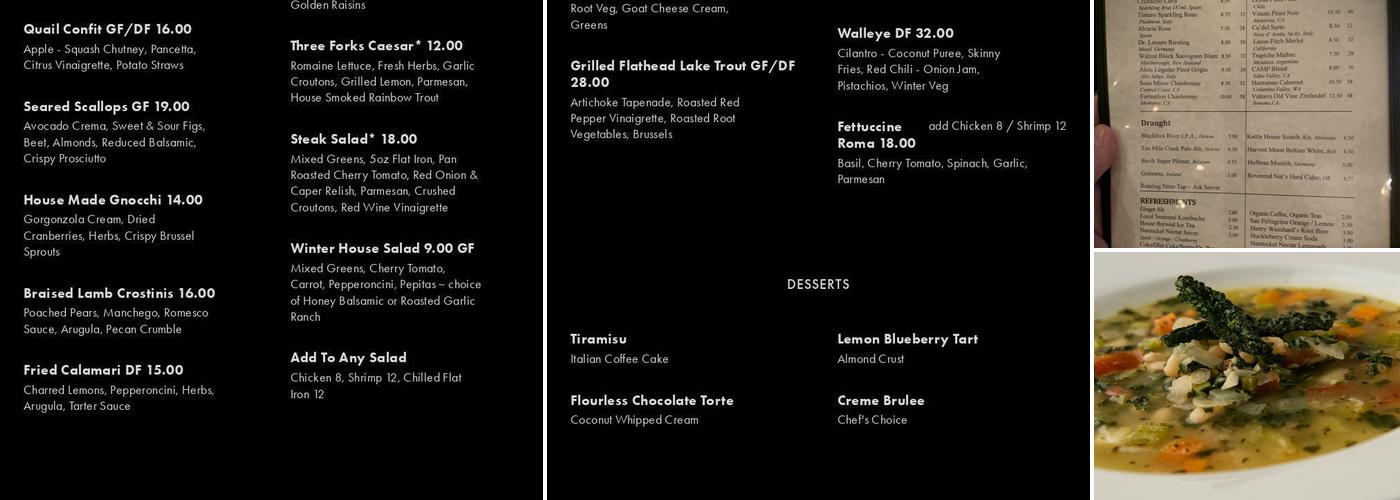 Three Forks Grille offers amazing food and service, treating all customers like royalty. The short ribs are packed with flavor. This upscale yet comfortable restaurant uses high-quality local ingredients for creatively crafted dishes. The bison fettuccine is a large serving that feels comforting and is made with tender bison that melts in the mouth. The staff is professional and friendly, with servers being highly attentive even during busy times. With a great bar and wine selection, fast service, and a relaxing atmosphere, it remains a top choice within a 20-mile radius of Columbia Falls. The walleye and the chicken dishes were excellent. The meat was under-seasoned. The lemon-strawberry tart was an awesome conclusion to a wonderful meal at a worthwhile price. The lamb skewer appetizer and the special lamb stew soup for starters were loved. The trout for dinner was delicious. The Huckleberry cannot and the blueberry lemon tart were enjoyed. Every worker in this restaurant hustles their butts off. They were impressive to watch.