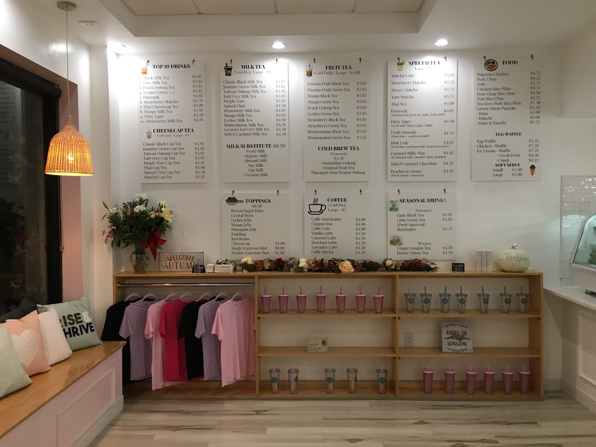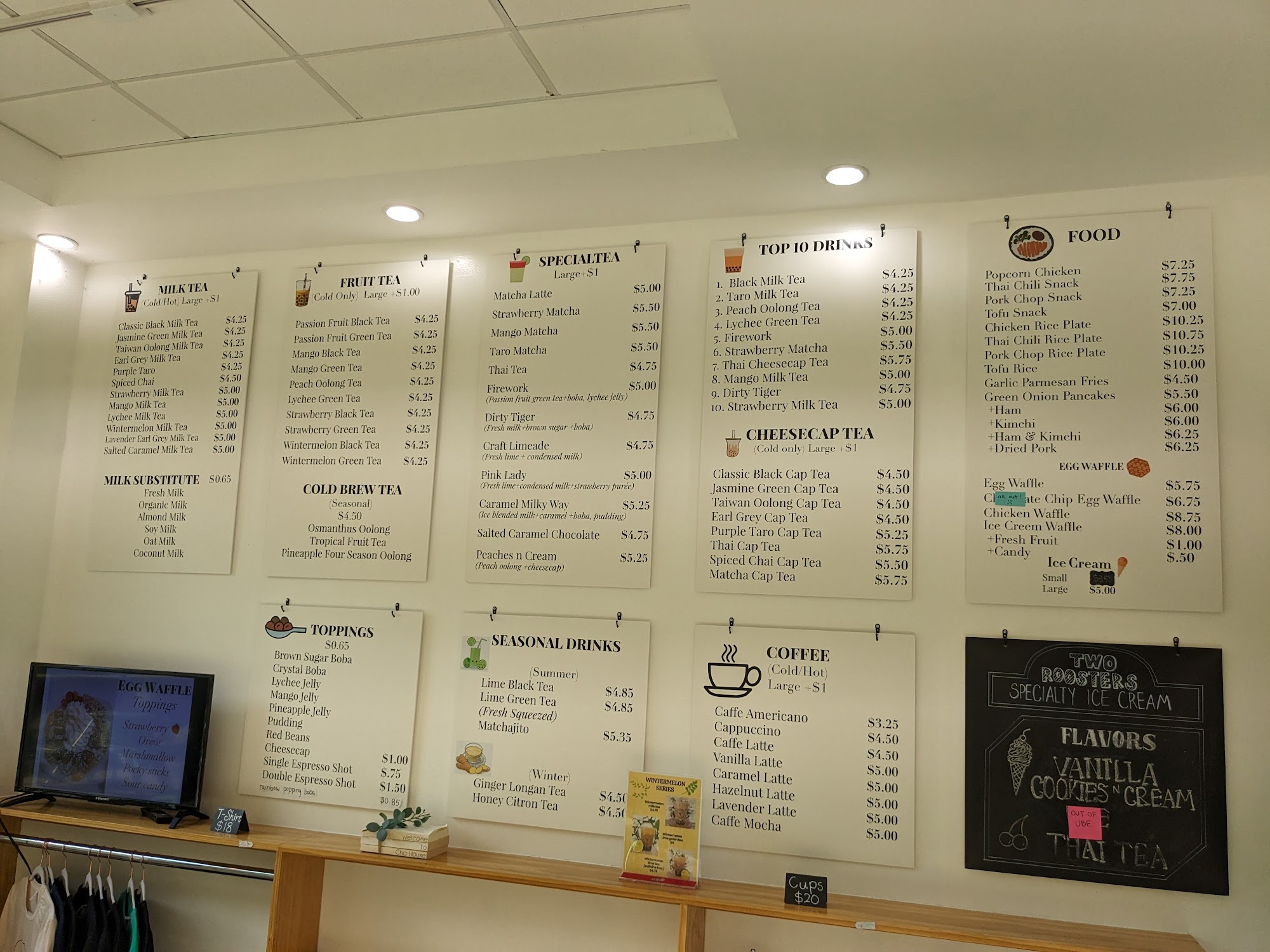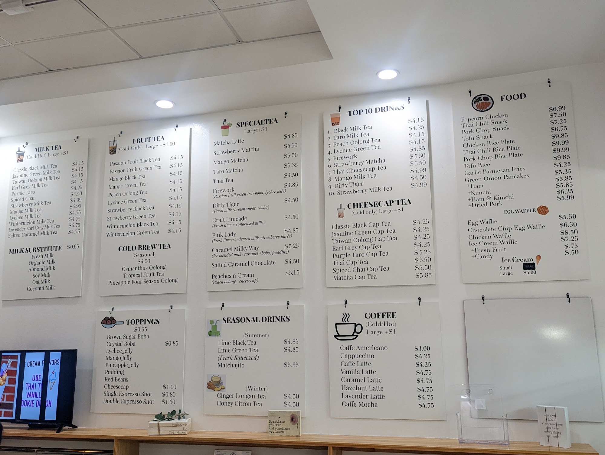 The tea was overly sweet, but decent; I recommend getting it less sweet unless you're looking for melted ice cream flavor. The ambience is stark white and almost clinical; sat to chat and the benches and stools were deeply uncomfortable. Plus, the music is just a Bluetooth speaker, so it's extremely loud anywhere near the speaker and not the most conducive to sitting and chatting. But the employees are attentive and the service is swift.