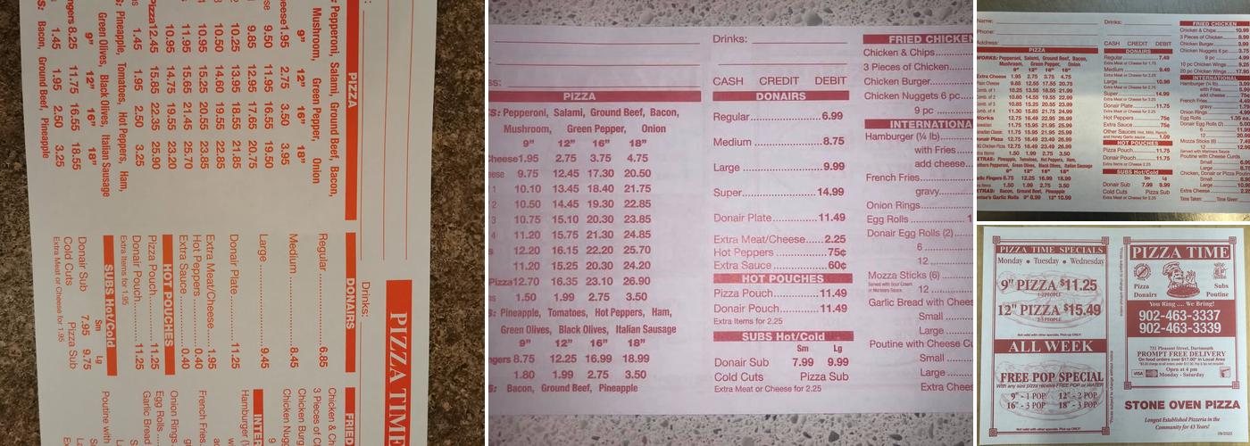 Pizza Time is a favorite among locals, known for its fantastic food and very friendly service. The staff and new owner are awesome, always ensuring the food is made just how you like it. The atmosphere is cozy and welcoming, like a second family. The menu offers top-tier options, with the donair poutine and Denise’s Garlic Rolls being standout favorites, along with their classic Nova Scotia donair and pep and cheese pizza, which many say is the best in HRM. The crust is unreal, with perfect sauce and great ingredients, all cooked with care. Located in Woodside, this restaurant's heart beats strong in the community, welcoming all with open arms. Plenty of parking is available behind the restaurant off of Carleton St. A must-visit spot for delicious pizza and a warm, inviting vibe.