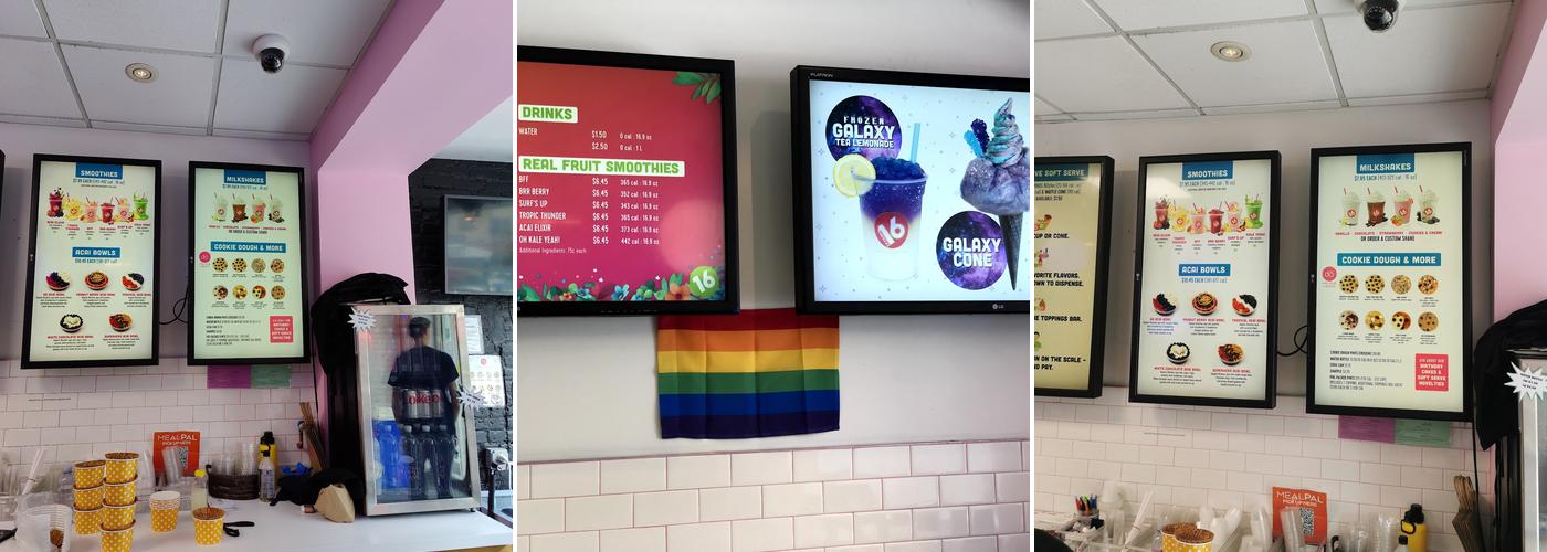 16 Handles offers a variety of frozen yogurt flavors with a self-serve option and a wide selection of toppings. The location is convenient, and the staff is friendly. While some flavors may not be the best, the menu frequently changes, providing new options. Customers can enjoy a selection of low-fat and non-dairy frozen yogurt flavors, including vegan oat milk chocolate that tastes exactly like regular chocolate. The self-serve format makes it easy to create the perfect cup, and the topping bar is well-stocked with fresh fruits, crunchy nuts, and sweets. The space has enough seating, and hygiene standards are high. The atmosphere is inviting, making it a good spot for a quick treat or a fun outing. Prices can add up quickly, with two medium-sized bowls costing around $16. Overall, the place is solid, offering tasty treats with the option to sample unlimited flavors before choosing.