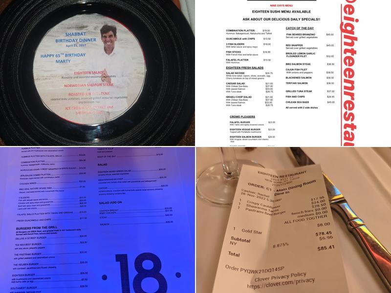 Eighteen is a popular neighborhood Israeli-style kosher steakhouse known for its fresh and delicious food, large portions, and welcoming atmosphere. The menu offers a variety of options, including sweet potato sushi, edamame, and avocado for vegetarians, as well as juicy high-quality burgers, kosher steaks, and chicken soup. Customers often enjoy a large bowl of tasty lentil soup, a hearty burger, and the Israeli salad and hummus platter. The food is tasty, hearty, and generous, with some dishes like schnitzel and grilled chicken platters being especially juicy and delicious with large portions. The service is friendly and attentive, with staff members often going above and beyond to ensure a good experience. The atmosphere is warm and welcoming, making it a favorite for families and neighborhood gatherings. Customers appreciate the warm pita, creamy hummus, and fresh fries that add to the enjoyable meal. While the room is clean, some find it not particularly beautiful, but the focus on friendship and good food makes it a popular spot. The restaurant is also praised for serving sushi and accommodating dietary restrictions. Although some find the pricing steep, overall, the experience remains positive, and many appreciate the quick service even when the restaurant is busy. It’s considered a great place for special occasions despite occasional service challenges.