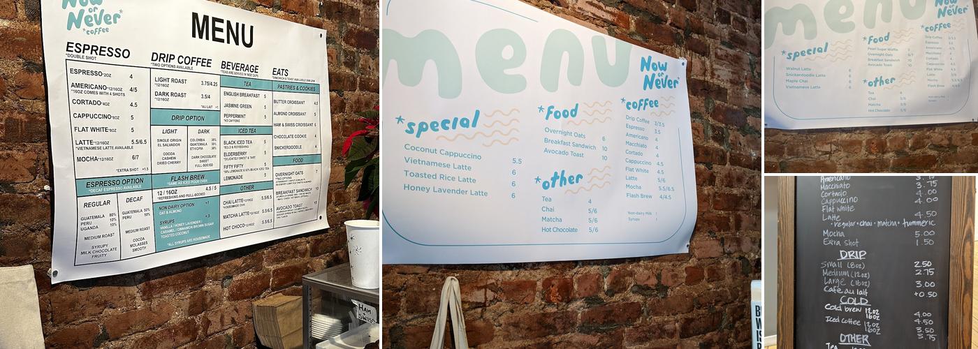 Now or Never Coffee is a charming small coffee shop in NYC that offers a variety of beverage options and attentive service. The space is somewhat cozy, with both small tables and comfortable couch/armchair seating, making it suitable for casual chats or solo studying. The croissants, baked fresh regularly, are praised as the best in the city. The staff is described as young, chill, and eager to serve customers with a smile. The coffee, iced tea, matcha, and chai latte are all delicious, and the decaf espresso is done very well. The pastries look fantastic, and the clean washroom/restroom is a plus. The atmosphere is ambient and good for studying or coworking, with comfortable seats and fast Wi-Fi. While one reviewer encountered a food shortage during their visit, they still enjoyed the intense and sweet Thai coffee, recommending trying it as intended. The chai here was highlighted as one of the best, tasting fresh and flavorful with all the spices coming through without being too sweet. Customers also find the coffee aroma enticing and the overall vibe cozy and comfortable, making it a good spot to relax or work. From its moody interiors to its sleek branding, Now or Never Coffee emphasizes curated detail, and the drinks live up to the aesthetic. Their iced lattes are well-balanced and refreshing, and seasonal options offer something a little unexpected but worth trying. Despite the name suggesting urgency, the ambiance is laid-back and intentional, making it a favorite for those wanting their coffee with a side of attitude.