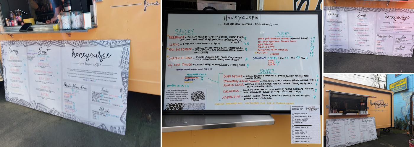 The restaurant is located in a vibrant food cart pod that features a full bar, trendy seating, and even a rooftop deck with skyline views. It is kid-friendly, with games like cornhole and Jenga that keep children entertained while waiting. The staff is consistently friendly and accommodating, with excellent service noted. The prices are considered fair for the quality of the food and service, and the atmosphere is lively and fun, even on weekdays. The covered seating and fire pits help keep the rain at bay, making it a great spot to enjoy some delicious waffles.