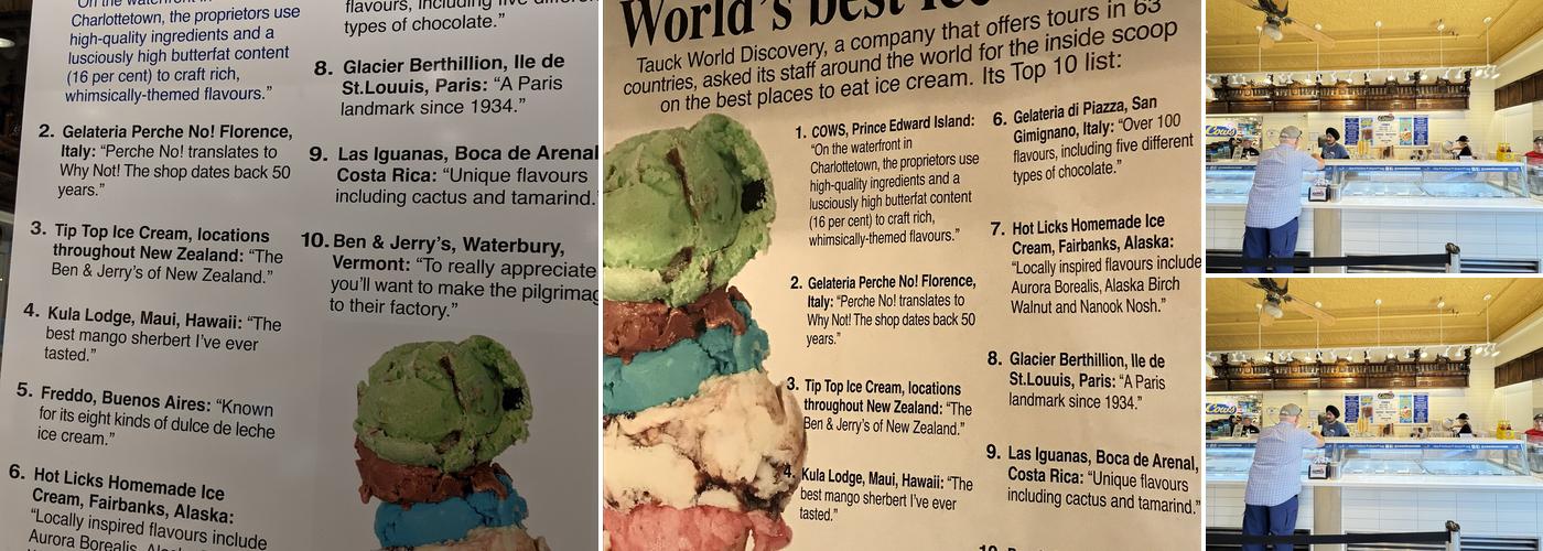 The waffle cones are freshly made, buttery crisp, and often rolled in jimmies, filling the shop with a wonderful smell. The staff is incredibly fast, friendly, and helpful, providing superb customer service and professionalism. The location also sells a lot of non-ice cream merchandise, including souvenirs and snacks, which are much cheaper compared to other local shops. While the square footage dedicated to merch might give a tourist trap impression, COWS is the real deal. Housed in a historic pharmacy with original woodwork and a tin roof, it is a fun, nostalgic stop and a true PEI institution. Many say no trip to Charlottetown is complete without a visit.