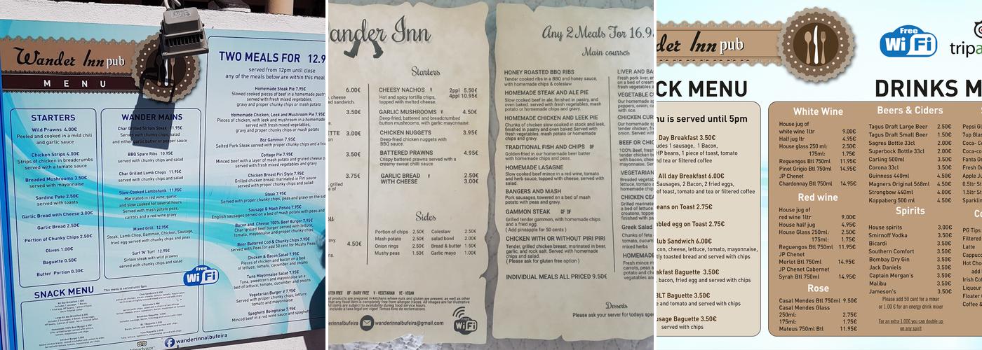 Wander Inn offers lovely, home-cooked English food with proper vegetables. The menu includes full English breakfast, Sunday lunch, homemade chips, lasagne, and gammon. The staff are friendly and efficient, and there is a happy hour from 12-5 pm. One impressed customer mentioned the waiter remembered their previous order. A recommended spot for good English grub at reasonable prices in Albufeira.