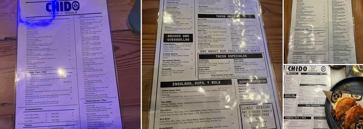 Chido Tacos and Tequila serves delicious and authentic fusion Mexican dishes. The menu features items such as the chicken fajita tacos, Thai curry taco, and boom boom shrimp taco, all with great flavor layering. The chipotle vinaigrette is a standout. Portion sizes are generous, although prices can be high. The birria burger and brunch burger are also tasty options, but note that the brunch burger comes with a runny egg. Prices are more justified during lunch specials. Overall, it's worth checking out and going back multiple times.