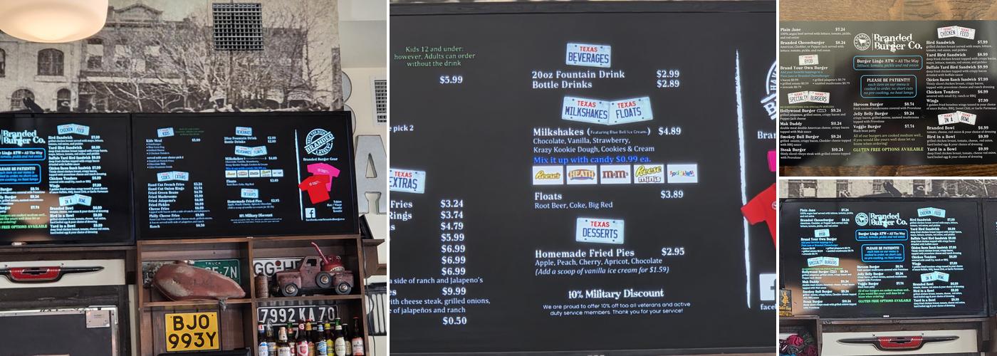Branded Burger Co. offers a classic Americana vibe with delicious burgers and "AWESOME" onion rings. Customers praise the tasty Big Red drink and the fun upstairs dining area with TVs and sports viewing. The restaurant has a lively atmosphere, hosting weekly trivia nights. The burgers are known to be good, juicy, and well-seasoned, with generous portions that often leave diners unable to finish their meals. The menu also features the Shroom burger cooked just right, and several flavors of homemade fried pies like apple and peach, which are very tasty. The fries are well cooked and seasoned, complementing the burgers nicely. The staff is friendly and respectful, and the interior is decorated with fun historical pictures, making it a fun place to eat. Although some customers noticed that the steak burgers are advertised as thinly sliced ribeye steak but are actually Philly steak, the flavor is still appreciated. The restaurant offers a good drink selection, including Diblin (TX) sodas and IPA. The prices are considered good, and the food is worth the cost despite some menu prices not matching the actual charge. Parking can be a bit challenging due to the downtown location, but the outstanding burgers and lively atmosphere make Branded Burger Co. a popular choice and a must-stop for visitors in the area.