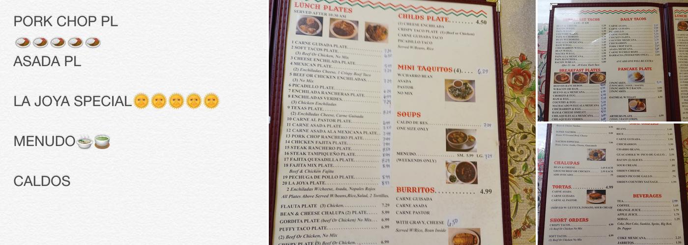 La Joya Durango is a family-owned restaurant serving amazing Mexican food. Customers love their flavorful dishes like homemade tortillas and yummy Flautas. The friendly staff provides excellent customer service and a great selection of meals. It's a must-visit spot for breakfast or lunch, with delicious food that keeps customers coming back for more.