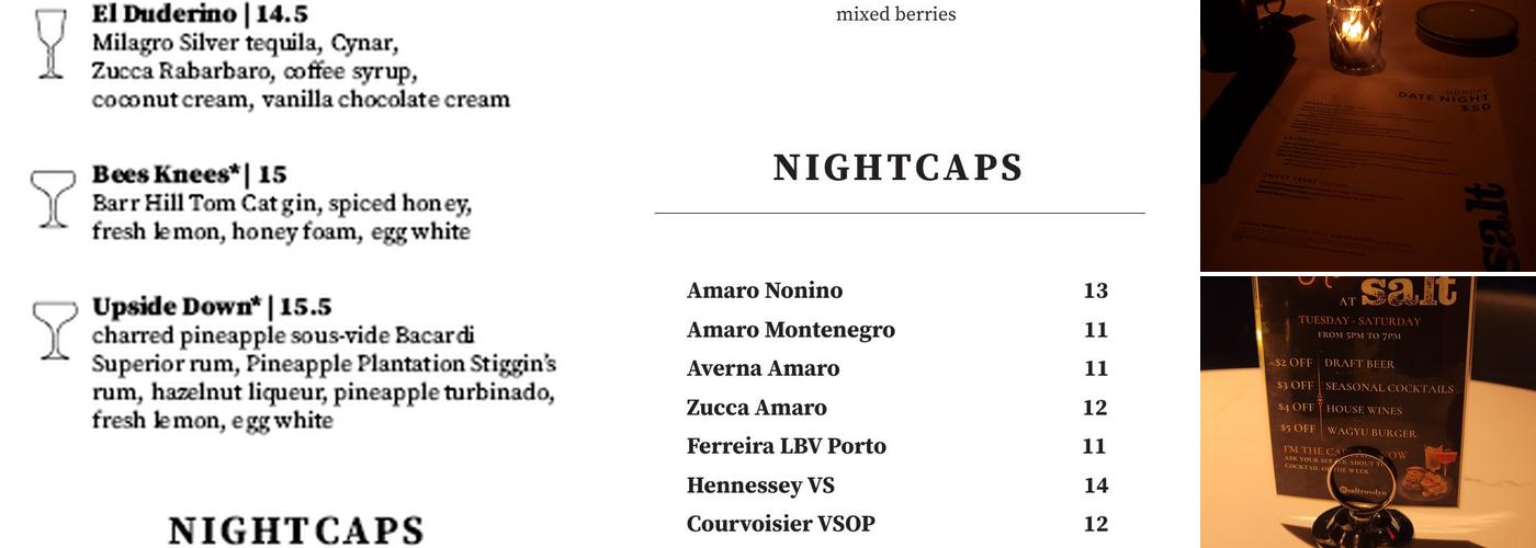 Salt is a cozy and intimate restaurant that offers a delightful dining experience. The food is exceptional, with the short ribs being described as delicious, rich, and filling. Reviewers have praised the flavorful food, especially the wagyu burger, Gambas al ajillo, Tuna tartare, Caesar salad, shrimp (Gamba) appetizer, and sea bass. The cocktails are both delicious and entertaining, with the Jedi mind tricks, Daddy Issues, Salt Margarita, and matcha my freak being favorites among guests. The atmosphere is chill but inviting, making it a great spot for a date night or dinner with friends. The Friday happy hour has great prices, with vibrant bartenders serving cool drinks that change with the season. The service is generally good, with attentive waiters who are friendly and knowledgeable. Some guests have noted issues with service speed during busy times, such as restaurant week, where flagging down servers can be difficult. A two-hour time limit at the table has also been mentioned, which can add pressure to the dining experience. Despite these concerns, Salt remains a recommended destination for those seeking a flavorful and enjoyable meal, with a prix fixe menu that offers great value.