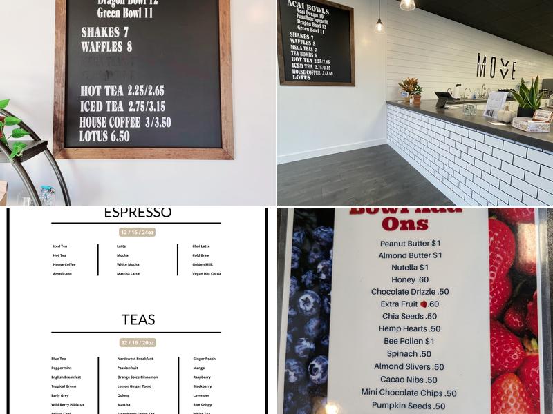 MOVE is a family-owned restaurant in Kitsap, known for its best Lotus Teas and Acai bowls. The owners are passionate about giving back to the community. With various dietary options and extra add-ins for the bowls and smoothies, MOVE is a great place to chill. Customers love the golden milk drink and spiced chai lattes. Whether you're looking to work remotely or study, MOVE welcomes you to enjoy their wonderful Acai bowls and smoothies while relaxing in a cozy atmosphere.