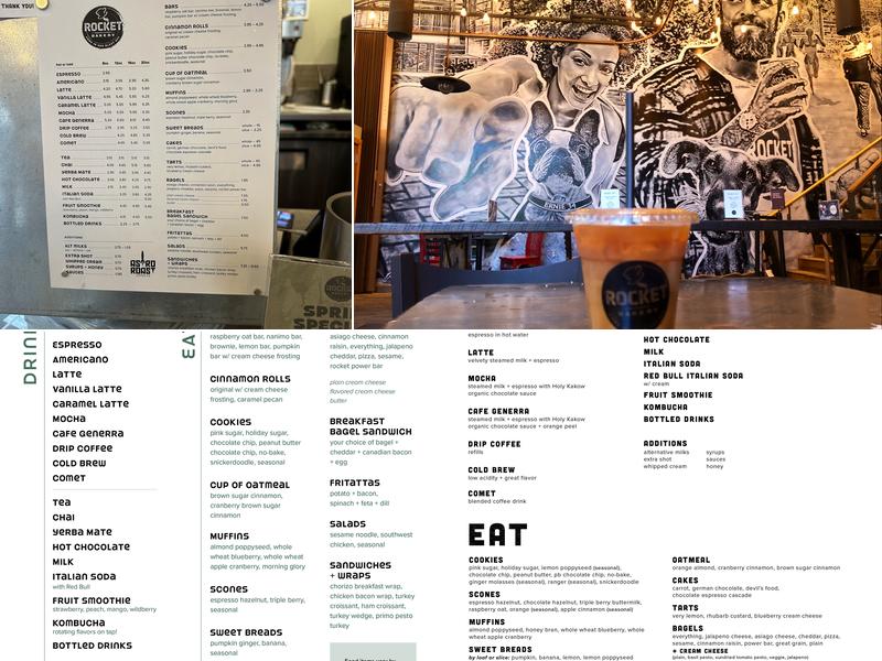 Rocket Bakery offers a comfortable and relaxing atmosphere, with cozy seating, available Wi-Fi, and a clean bathroom. They have an interesting selection of drinks, including an icy matcha drink. The coffee house features a nice interior and the scones and hot chocolate are delicious. Customers praise the helpful and kind staff.