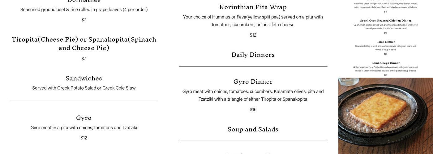 Came for lunch on a Saturday . Everything was so delicious! My husband had the gyro deluxe and I had the Korinthian Pita Wrap. We each had the potato salad as our side and that was amazing ! Staff was very friendly . I thought the portions were great and prices were fair . It was our first time this cute little place and we definitely will be back .